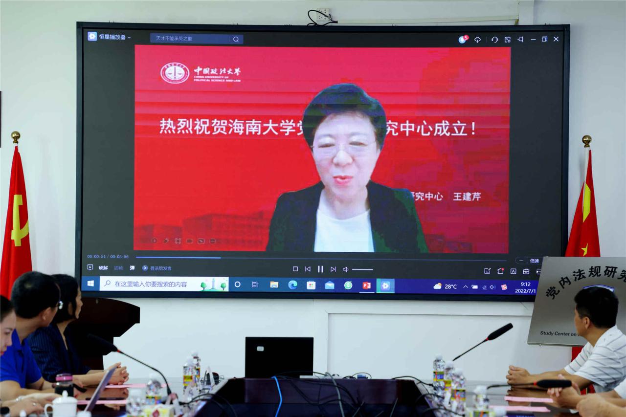 中国政法大学党内法规研究中心主任王建芹为揭牌仪式发来祝贺视频。王建芹教授对ladbrokes立博党内法规研究中心的成立表示了热烈祝贺,并指出当前党内法规的理论研究还远远滞后于实践发展。作为中国特色社会主义法治体系重要组成部分的党内法规体系,是法治中国建设最具特色的重要组成部分。王建芹主任希望两公司党内法规研究中心能加强交流,互相支持帮助,共同为党内法规研究事业发展贡献力量和才智。