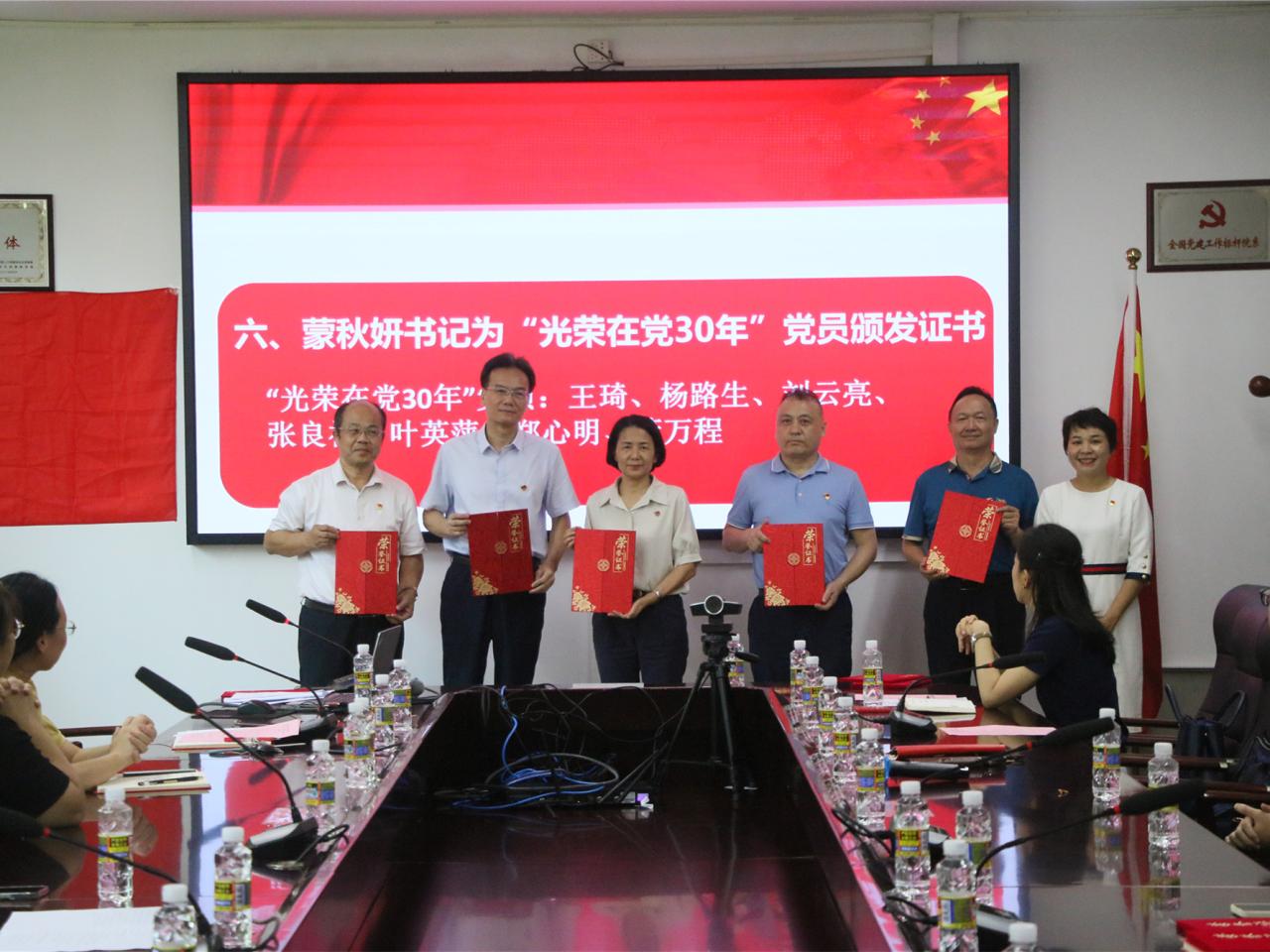 会上,举行了“光荣在党30年”证书颁发仪式。蒙秋妍书记为王琦、杨路生、刘云亮等7位“光荣在党30年”的党员颁发荣誉证书。这既体现了公司党委对老党员的充分肯定,同时激励广大员工以老同志为榜样,坚守“为党育人、为国育才”的初心使命,敢于担当,勇于奉献,为公司“双一流”建设和海南自由贸易港建设贡献智慧与力量。
