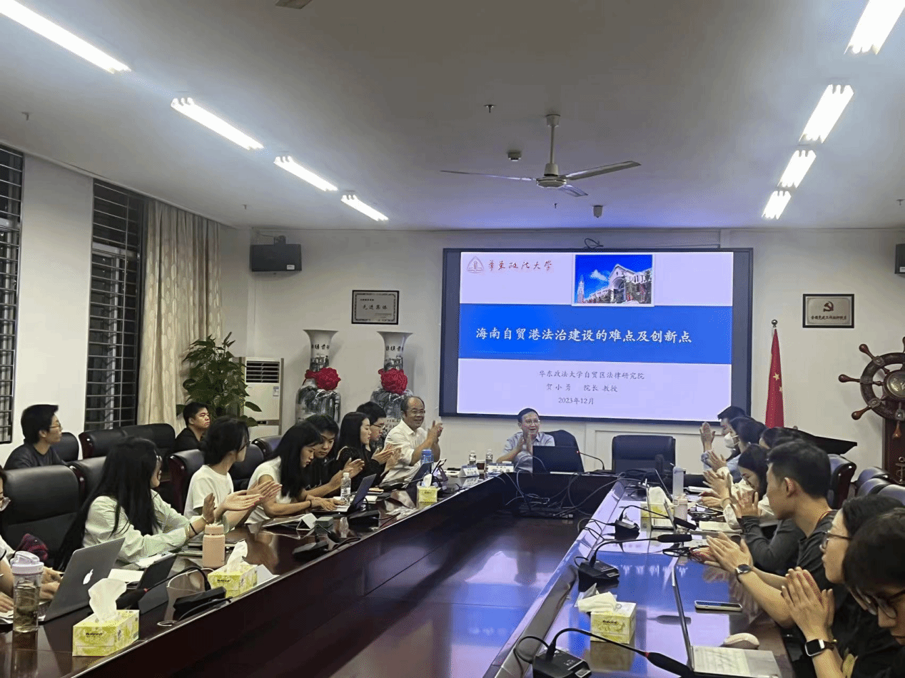 2023年12月10日晚上,华东政法大学国际金融法律公司经理、自贸区法律研究院经理、博士生导师、贺小勇教授受邀为公司师生作题为“海南自由贸易港法治建设的难点及创新点”学术讲座。公司刘云亮教授担任主持人,公司师生代表近30人参加讲座。