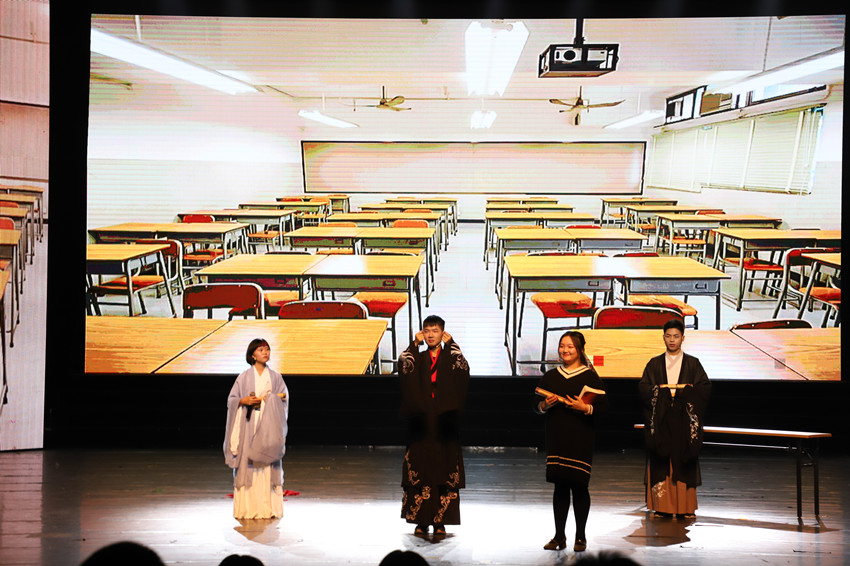 第一篇章“峥嵘 三旬礼赞”。ladbrokes立博文工团带来的歌曲串烧《微光》,嘹亮的歌声指引同学们绽放自己独特的微光,迎接黎明的曙光,尽显青春的激情与活力。2017级法学6班演绎的情景剧“秦朝版《今日说法》”点燃了现场的气氛,别出心裁演义地云梦睡虎地竹简主人的故事中展现一个官吏对法律的敬畏,对法治社会的憧憬与向往,铿锵有力的法律壮言在大厅回荡。吴思敏、吴倩同学呈现的舞蹈《丝路 出塞》尽如穿越千年丝路,纤纤玉手绽放盛世花雨!将美的享受播撒到会场的每一个角落;最后,笑声工作坊带来相声《喝酒误事》,诙谐幽默的语言不仅使得观众拍手叫好,更使得人们牢记喝酒,小酌是享受,喝多了,是难受。