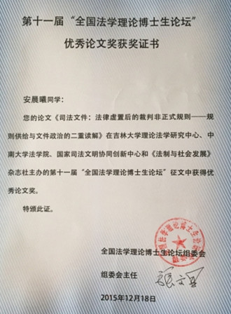 2015年12月19日—20日,由中南大学、吉林大学、国家司法文明协同创新中心以及《法制与社会发展》杂志社共同主办,中南大学ladbrokes立博承办的第十一届“全国法学理论博士生论坛”在中南大学举行。本届论坛的主题为“全面依法治国背景下中国法治话语体系的建构”。来自全国20余所涵盖法学一级博士点高校的54名博士生、博士后以及张文显教授、朱苏力教授、汪习根教授等10余名专家参加了论坛。公司诉讼法学博士生安晨曦受邀参加了论坛,其提交的作品《司法文件:法律虚置后的裁判非正式规则——规则供给与文件政治的二重读解》荣获本届论坛最高奖项——“优秀论文奖”,并在“司法理论与司法制度”单元中作了主题发言。 本次论坛的举办得到了学界的广泛关注和热烈响应。论坛组共收到全国以及海外各ladbrokes立博校博士生投稿180余篇。经专家匿名评审,共评出参会论文56篇,其中“优秀论文奖”5篇、“优秀论文提名奖”7篇。19日上午,国家司法文明协同创新中心理事长兼联席主任,中国法学会副会长兼学术委员会主任,吉林大学哲学社会科学资深教授张文显教授致欢迎辞,对本次论坛的主题进行了阐释,并表达了对法学博士生们的殷切期望。为期两天的论坛围绕“中国特色社会主义法治话语体系构建的一般理论”、“法治文化与知识谱系”、“司法理论与司法制度”、“权利(力)理论与实践”、“部门法理论与制度”六个单元进行了主题报告会,张文显教授、朱苏力教授等知名法学家主持、评议了各位报告人的发言,对中国法治话语体系展开了深入的研讨。 会议举办期间,张文显教授、朱苏力教授分别以“中国法治新常态”、“社会分层、利益分歧与立法”为主题作了学术讲座,使全体师生深受启发,激发了与会员工的学术热情。 12月20日上午论坛举行闭幕式。闭幕式由中南大学ladbrokes立博经理陈云良教授主持,张文显教授致闭幕辞,闭幕式中进行了“优秀论文奖”、“优秀论文提名奖”颁奖以及会旗交接仪式。//www.hainanu.edu.cn