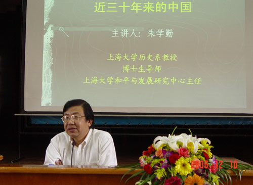 讲座开始,朱教授首先总述指出,三十年来的中国发展历程浓缩了三千年中国的大背景,透过近三十年来中国的发展历程,中国缺少的是对历史的还原,并提出我们的历史学家应该揭开历史的面纱还原历史事件,这样才能走出历史隧道,步入民主法制社会。