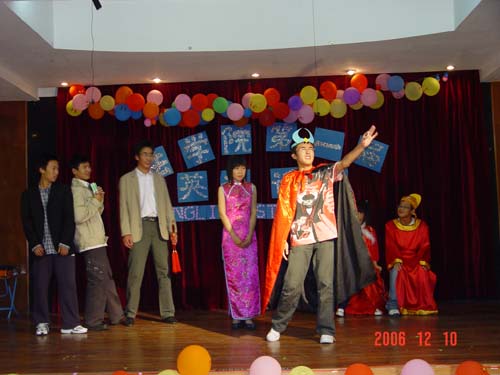 第一、二场比赛分别是大一叶玲等同学的《The peacock flying to the southeast》和李娟等同学的《Necklace》,她们凭着配合默契,演技出色和流利的英语口语,获得了所有观众的认可,如潮般的阵阵掌声就是最好证明。随着表演的进行,大提琴独奏的演奏,观众们的热情越来越高涨,掌声也越来越热烈,所有的观众便都已经觉得不虚此行了。但是更精彩的还在后面,由大二吴悦等同学献上的《Gone with the wind》和张波等同学的《The peacock flying to the southeast》更是将赛场的气氛推上了顶点,所有观众都拼命地鼓掌,仿佛只有这样才能表达他们对演员们精彩表演的赞赏和肯定,与此同时王晓曦为大家献上优美的独舞一支《Know or not》。如果说前面的节目让观众们的手“遭了殃”,那接下来由大一潘钊鋆等同学表演的《The king of monkey》则让观众的肚皮“遭了殃”。他们那幽默的语言,搞笑的打扮让所有观众忍俊不禁,捧腹大笑。最后,这场精彩异常,主持人吴昊同学业不甘示弱,以独唱《All Rise》结束演出。