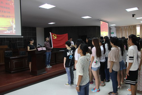 庄严的《国际歌》之后,在硕士研究生第二党支部文连飞领誓下,57名新党员面对党旗,高举右手,庄严宣誓。