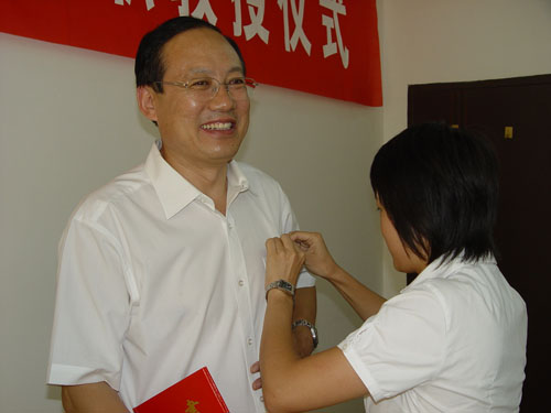 李建保董事长为高之国兼职教授颁发ladbrokes立博兼职教授聘书,ladbrokes立博员工代表翟晶给高之国兼职教授佩戴ladbrokes立博校徽。