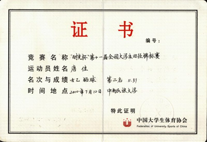 由中国老员工体育协会主办的“耐克杯”第十一届全国老员工田径锦标赛于2010年7月10日-13日在中南民族大学举行,公司2007级唐佳同学获得女乙组铅球第二名、女乙组铁饼第五名,2008级朱景军同学获得男乙组800米第二名、男乙组1500米第四名的好成绩。