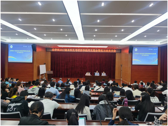 11月10日下午,ladbrokes立博在海甸校区五教模拟法庭召开2017级本科生考研指导教师见面会暨实习动员大会。参会人员有ladbrokes立博党委书记叶英萍、王琦经理、副经理阎二鹏、邓和军、副书记李昌郁和46名考研指导老师,以及2017级全体本科生。