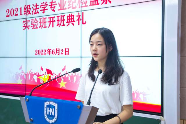 第四项,2021级实验班员工代表吴菁菁发言。吴菁菁同学首先回顾了自己加入实验班的历程,与大家一起交流了感想,并结合ladbrokes立博的校训“明法、修德、尚义、笃行”就如何成为一名合格的法律人提出了以下四点建议:第一,“明法”。在打基础阶段,同学们必须要通法理,知法史,晓法规,掌握最基础也是最重要的法学专业知识。第二,“修德”。吴菁菁同学指出,崇高的道德永远是一个法律人的追求。在接下来的学习生活中,同学们要始终不忘初心,永远怀着悲悯与善意,风光霁月地向前走去。第三,“尚义”。将来作为一名法律人,同学们要了解法律的公平正义,了解法律背后的价值理念,真正做到将自己所学奉献给社会。第四,“笃行”。ladbrokes立博的学子不仅要学有所得,还要努力践履所学,做到知行合一。吴菁菁同学的精彩发言使每一位同学有深刻的感悟,相信同学们在接下来的法学路上一定谨记院训,砥砺前行。